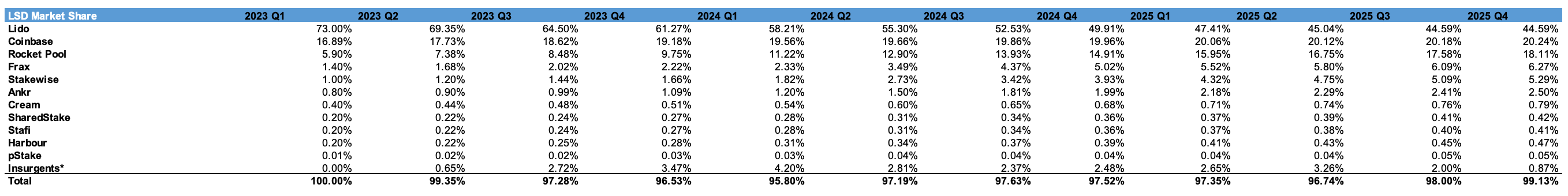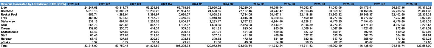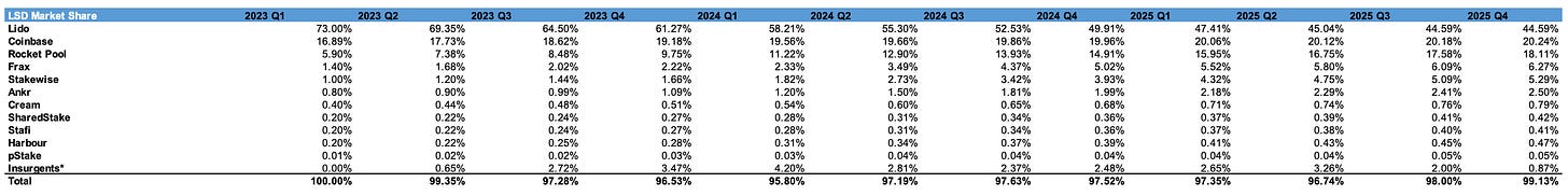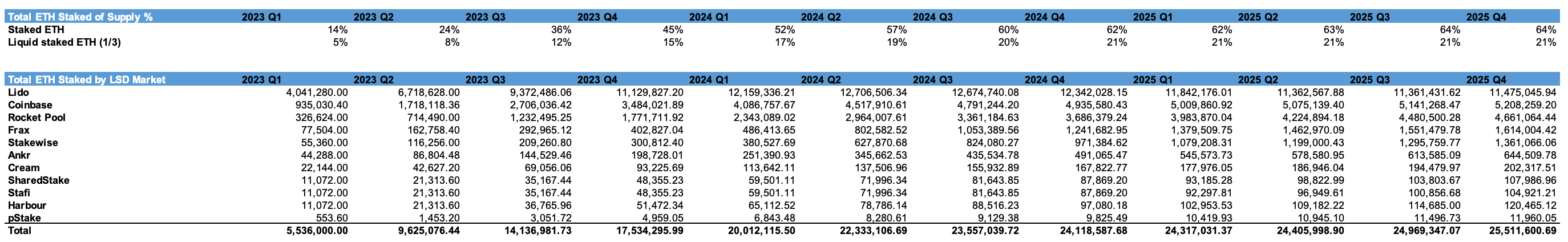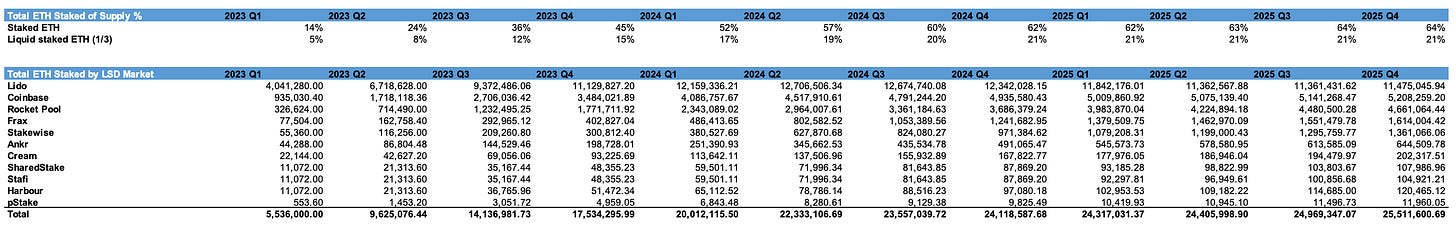 Insurgents in this table are new protocols that will emerge after the release of Eigenlayer as people will be willing to take on more risk. Towards the end of 2025, people are expected to return to Lindy protocols that carry less risk as a “safe haven” to stake their ETH. Also, if people's aim is to decentralize the network further over time, I have made the assumption that getting Lido below 50% market share will be the initial target.