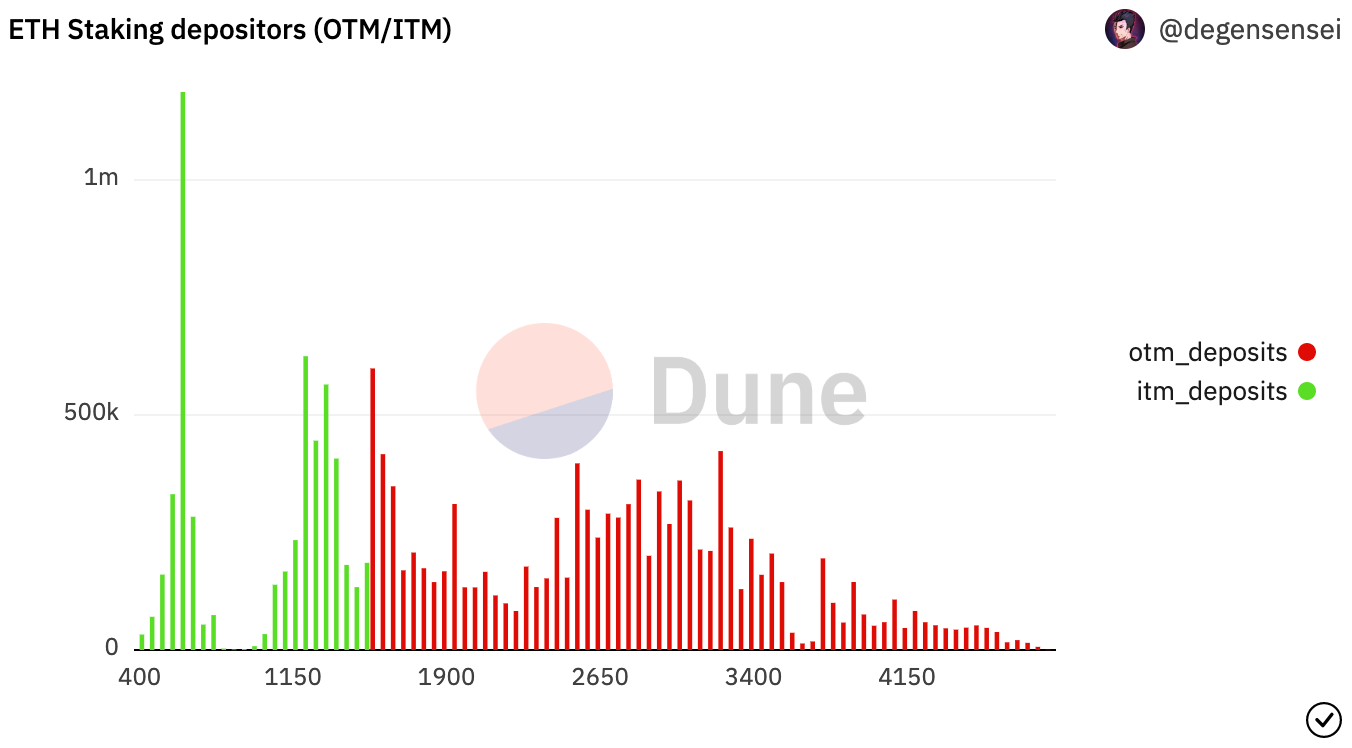 As it currently stands, 13.84% of the total Ethereum supply is staked which amounts to 16.6M ETH. However, people tend to forget that a large cohort of these stakers are underwater from their ETH deposits and might not necessarily feel the need to sell.